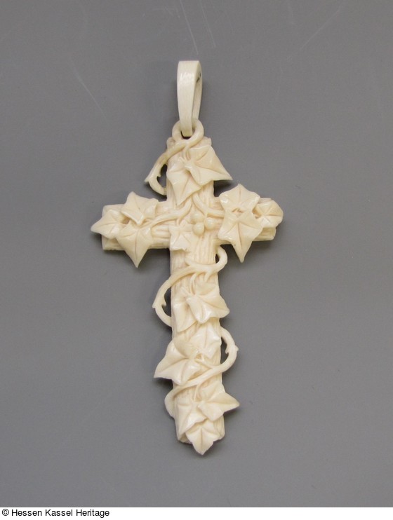 Kreuzanhänger aus Bein, von Efeu umrankt |