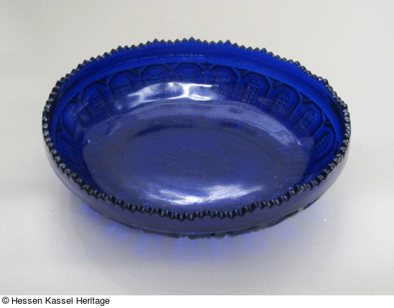 Blaues Glas, luftgepreßt, aus vierteiliger Form, Nähte teilweise beseitigt. |