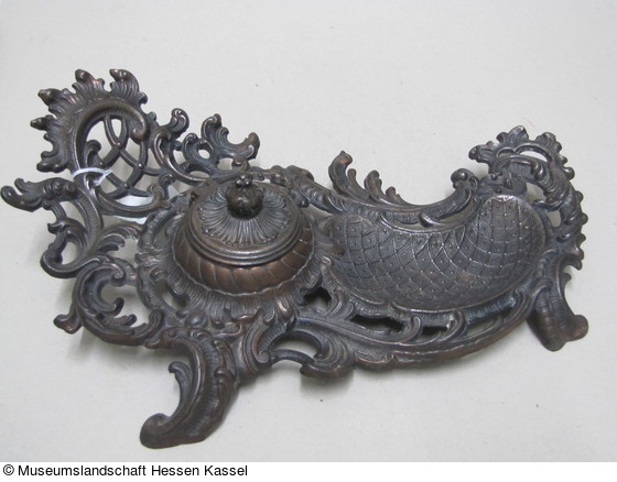 Eisenguß, galvanisch verkupfert und bronzefarben patiniert. Deckel und Knauf extra gegossen, verschraubt bzw. durch Scharnier verbunden. Glas. |