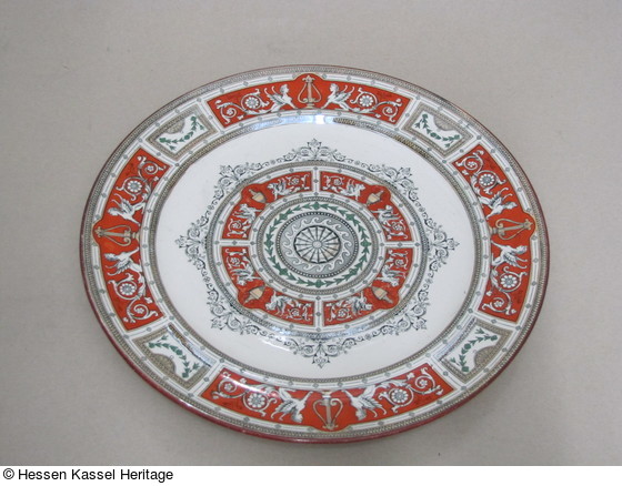 Flacher Steingutteller mit gedrucktem ägyptischen Dekor, von Hand farbig bemalt, aus dem Service "Regent"