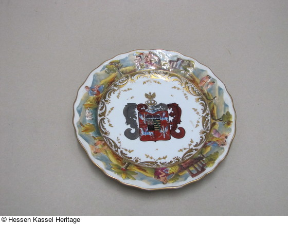 Porzellanteller mit Reliefdekor auf der Fahne und gemaltem polnischen Wappen im Spiegel |