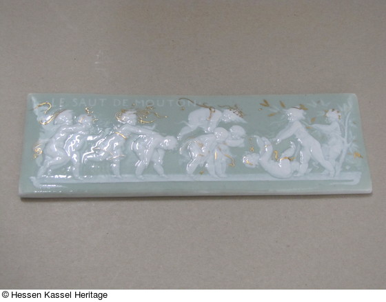 Porzellan, mit Seldonfond (Eisen- oder Chromoxidschlicker), darauf weißes Porzellanrelief in Pâte-sur-pâte-Technik, Transparentglasur, Kaltgolddekor. |