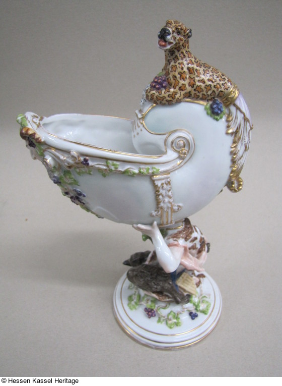 Porzellan-Nachbildung des silbernen Nautiluspokals mit Satyrschaft von Balthasar Permoser (1651-1732) , Berlin um 1707, Grünes Gewölbe, Staatliche Kunstsammlungen Dresden.