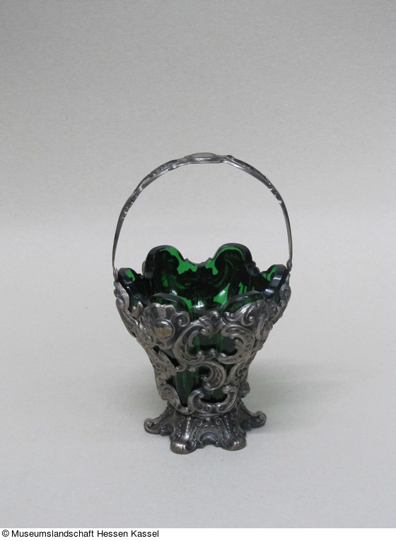Dickwandiges, dunkelgrünes Glas, formgeblasen, Boden ausgeschliffen. Montierung Silberblech, in 3 Teilen gestanzt, verlötet. Bügel gegossen. |