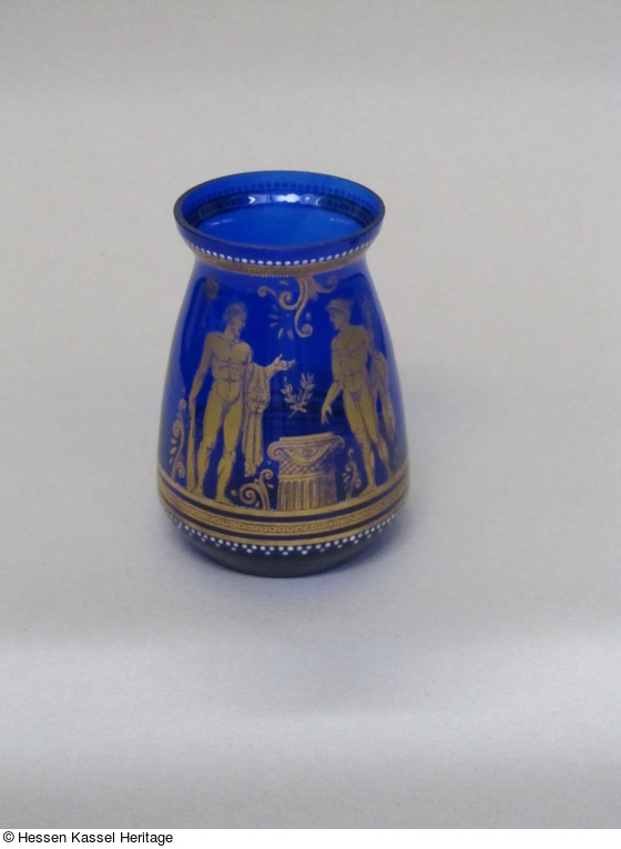 Dunkelblaue Glasvase mit Herkules und Merkur in Goldmalerei |