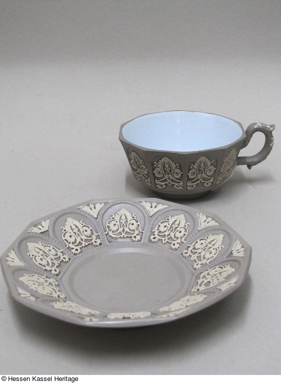 Graugrünes Steinzeug, die aufgelegten Ornamente beigefarben, formgedreht, matt glasiert, die Tasse innen weiß glasiert. |
