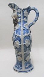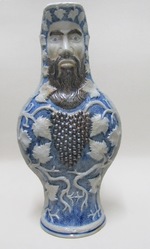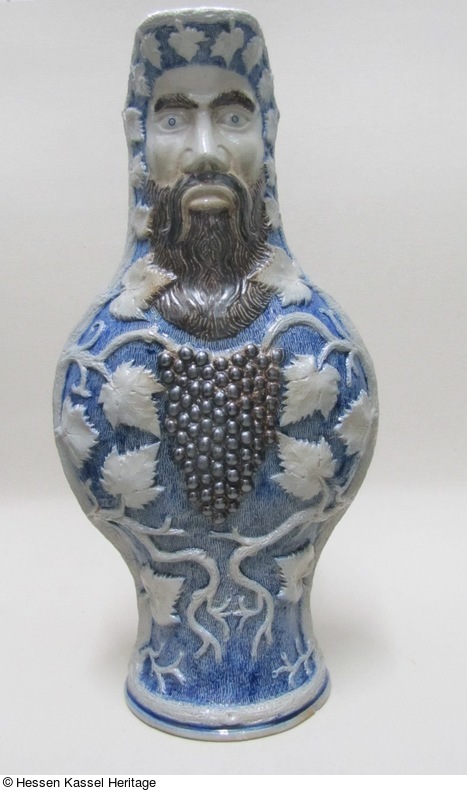 Graues Steinzeug, aus zweiteiliger Form gefertigt, Maske, Blätter und Trauben aufgelegt, farbig glasiert: der rindenartig geriefelte Grund kobaltblau, Bart und Augenbrauen der Bartmannsmaske braun, Weintrauben noch dunkler braun, fast schwarz. Die Weinreben und Weinlaubblätter sowie das Gesicht der Bartmannsmaske bleiben farblos. |