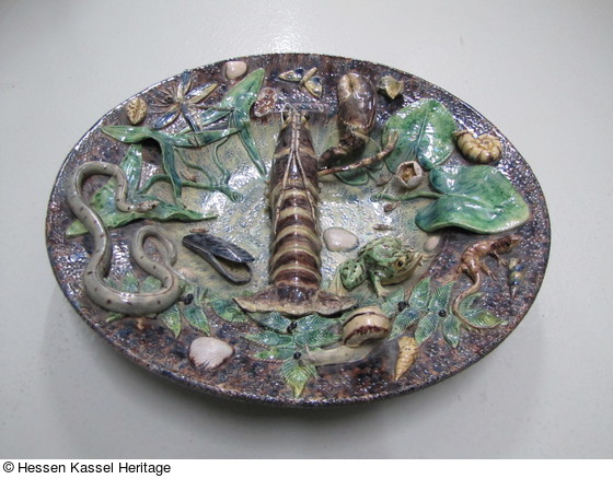 Fayence mit farbiger Bemalung unter leicht irisierender transparenter Bleiglasur. |