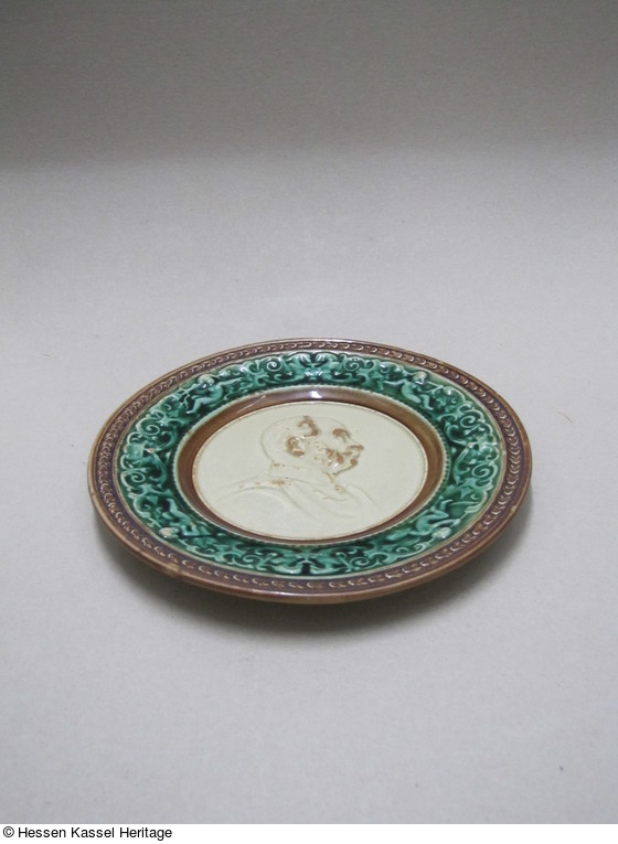 Kleiner Steingutteller mit dem Reliefbildnis des Kaisers Franz Joseph in einerm Neurenaissance-Ornamentrahmen |