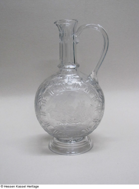Farbloses Glas, formgeblasen, Kugel- und Kerbschliff, Henkel angesetzt, Mattschliff. |
