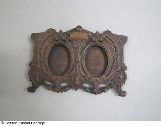 Holz, gepreßt. Die Rückwand ist durch zwei Scharniere mit der Vorderseite verbunden. |