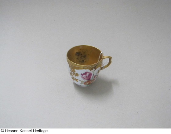 Porzellan, formgefertigt, bunte Bemalung in Unterglasur, Vergoldung des Reliefschmucks, des Henkels und des Inneren der Tasse. |