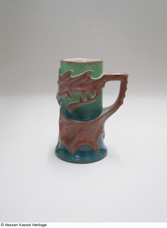 Ton, ziegelroter Scherben. Obere Hälfte hellgrün, die untere dunkelgraugrün glasiert (gespritzt und ineinander verlaufend), Reliefdekor, Henkel, Bodenunterseite und Lippe ziegelrot, Inneres weiß. |