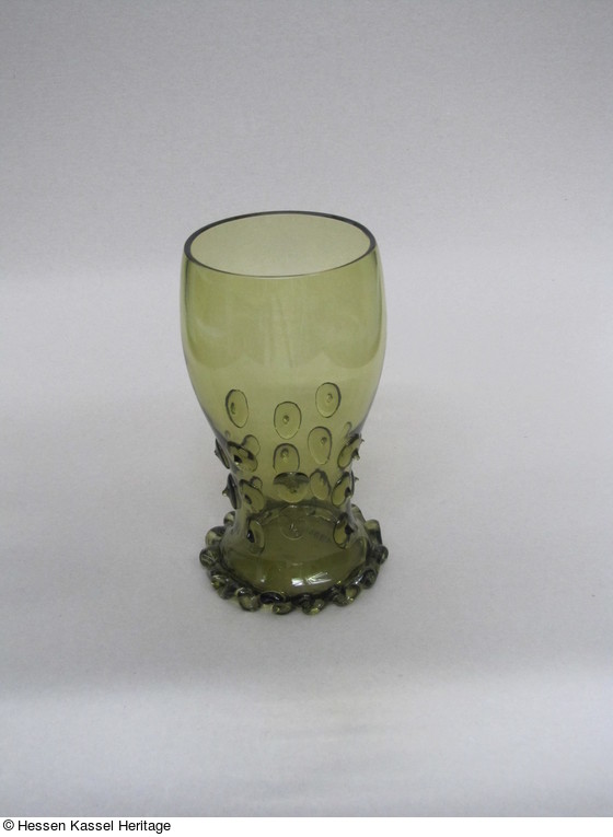 Hellgrünes Glas, formgeblasen, hüttenmäßig verziert. |