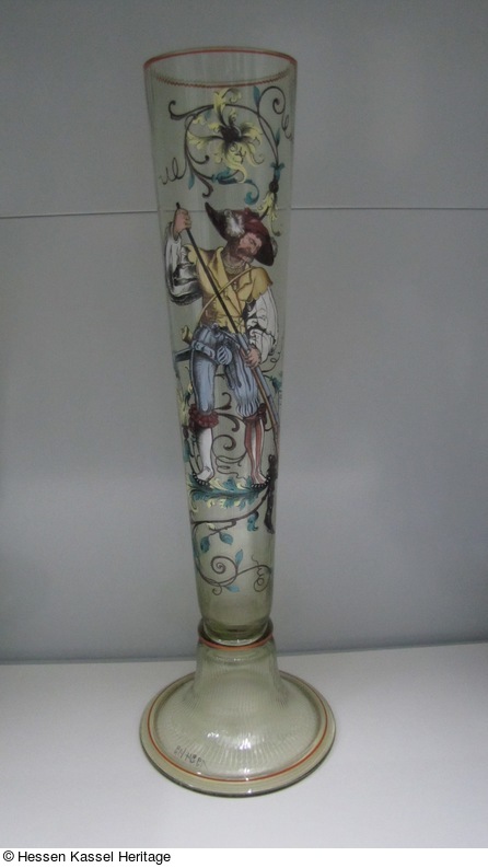 Grünliches Glas, sog. Waldglas, formgeblasen, bunte Emailfarben. |