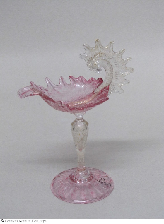 Zierschälchen auf hohem Fuß aus rosa und farblosem Glas |