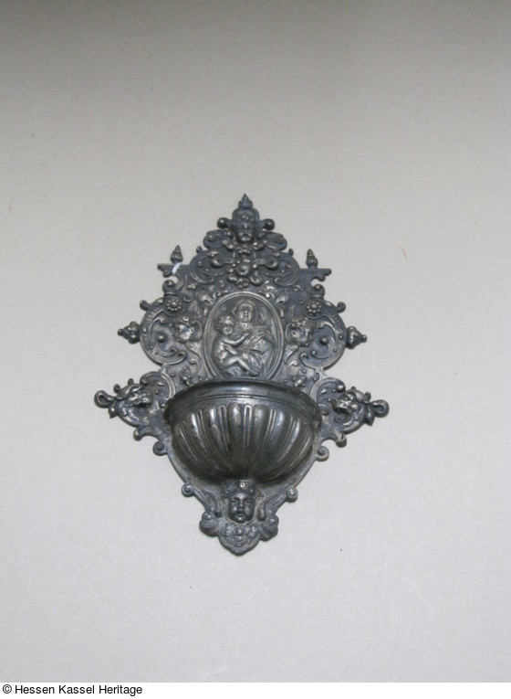 Weißmetall (Neusilber), gestanzt, in zwei Teilen gefertigt. Das Weihwasserbecken wurde auf die Rückwand aufgelötet. |