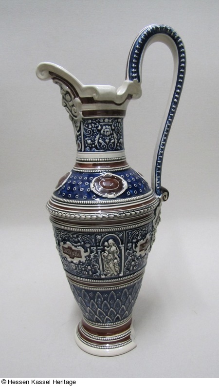 Helmkanne aus elfenbeinfarbenem Feinsteinzeug mit Reliefdekor (Tugenden) im Stil der Neurenaissance