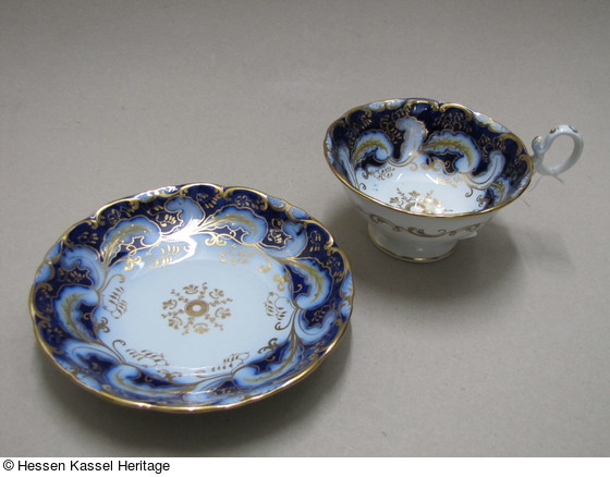 Porzellan-Tasse und Untertasse im Stil des Zweiten Rokoko