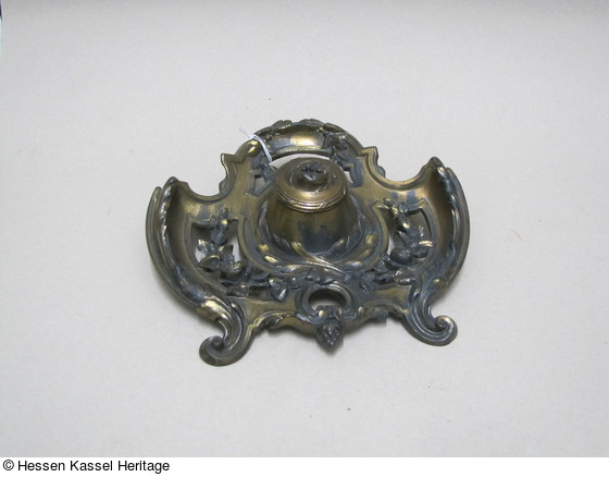Zinn gegossen, galvanisch vergoldet, aus zwei Teilen gefertigt, Deckel durch Scharnier mit dem Tintenfaß verbunden. |