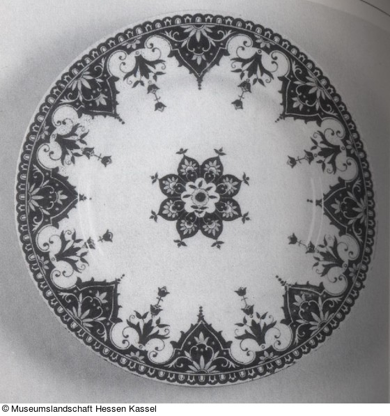Fayence, rötlicher Scherben, ursprünglich weiße Glasur, die durch das starke Craquelée bräunlich wirkt; stellenweise stockfleckig; Umdruckdekor in Kobaltblau und Dottergelb. |