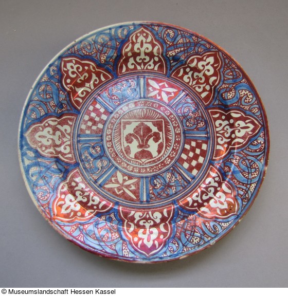 Ulisse Cantagalli (+1902) stellte seit 1878 in dem im 18. Jahrhundert gegründeten Familienunternehmen historisierende Keramik her. Der vorliegende Teller orientiert sich an spanischen Lüsterfayencen des 15. und 16. Jahrhunderts, welche die von den Arabern nach Spanien eingeführte Lüstertechnik zu einem einzigartigen Höhepunkt führten, aber auch an Lüsterfayencen der italienischen Renaissance. Die Mängel in der Ausführung weisen wohl auf die Schwierigkeiten hin, die sich bei der Wiedergewinnung der alten Techniken ergaben.