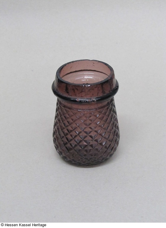 Durchsichtiges rosa Preßglas, luftgepreßt, aus dreiteiliger Form gefertigt, die Nähte teilweise beseitigt. |