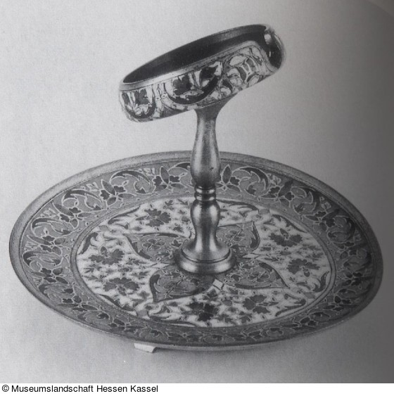 Von allen Uhrenständern der Kasseler Sammlung ist dies die funktionellste Lösung. Die allgemeine Form ist durchaus westlich bestimmt, das Ornament sucht dagegen seine Vorbilder in der orientalischen, vor allem in der persischen Kunst. Auf der Weltausstellung von 1862 in London war zum ersten Mal chinesisches, japanisches und indisches Kunsthandwerk in großem Umfange gezeigt worden. 1867 stellte Barbedienne bereits Geräte aus, in denen man die chinesische Cloisonné-Technik und indischen oder persischen Dekor wiedererkannte.