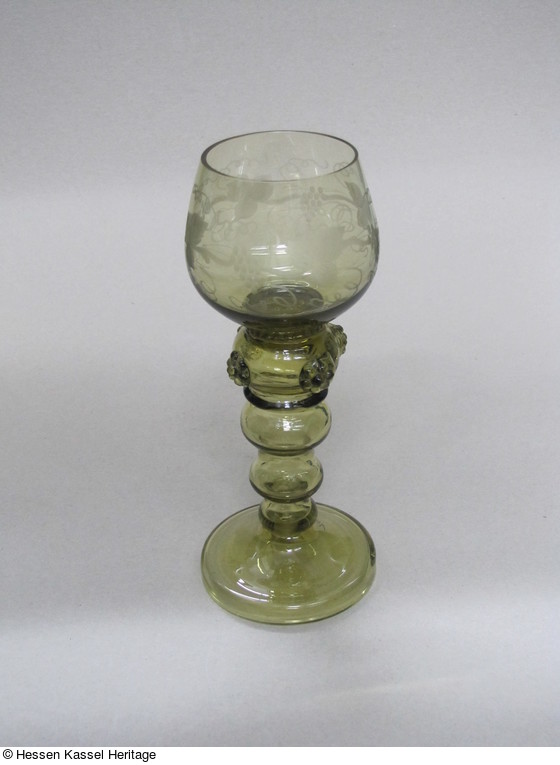Römer (Weißweinglas) aus grünlichem Glas mit Noppen und Mattgravur (Weinranke) auf der Kuppa |