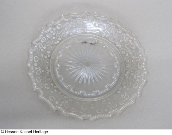 Teller aus farblosem Preßglas mit Blütenranken auf der Fahne