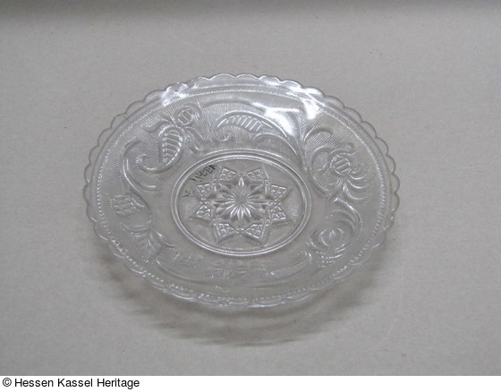 Kleiner Teller aus farblosem Preßglas mit Ranken auf der Fahne |