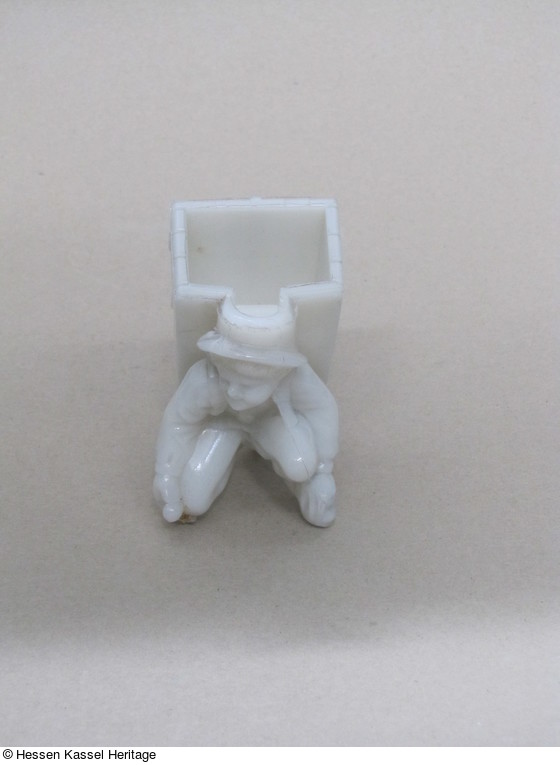 Federablage aus gepreßtem Beinglas in Gestalt eines knienden Knaben mit Kiepe
