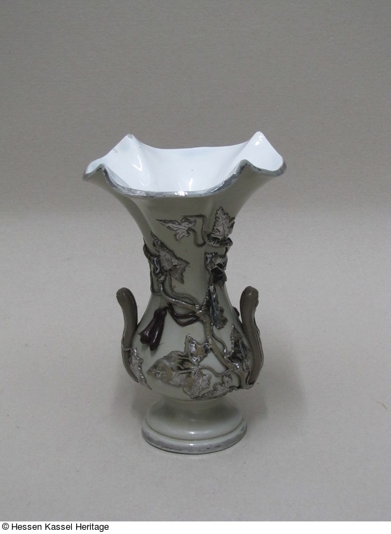 Feinsteinzeug, brauner Scherben, aus zweiteiliger Form gefertigt, graugrün außen, innen weiß glasiert. Dekor teilweise platiniert. |