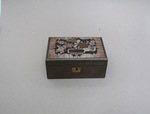 Rechteckiges Andenken-Kästchen aus Holz, auf dem Deckel ein Steinmosaik (Blütenzweig) aus Karlsbader Kalksinter