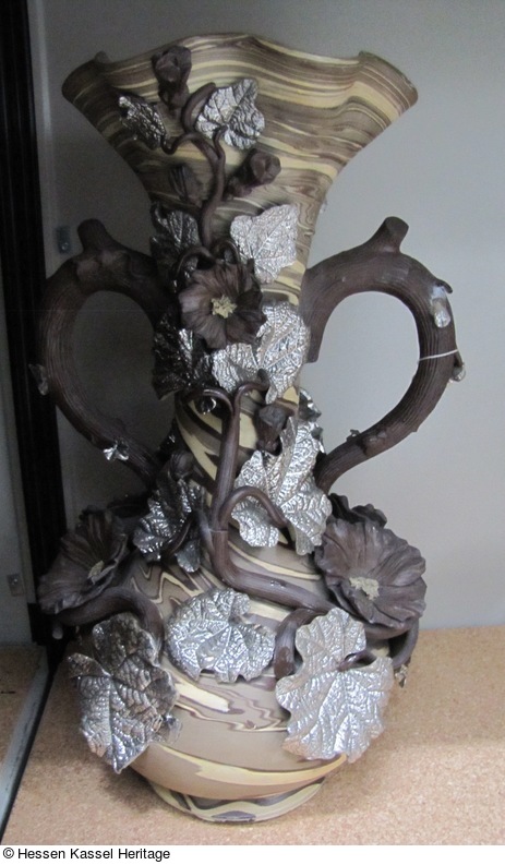 Feinsteinzeug, verschiedenfarbig, marmoriert, Dekor plastisch aufgelegt, Henkel angesetzt, Blätter platiniert. |