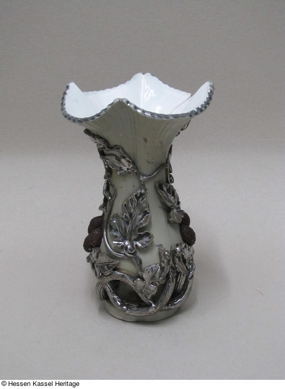 Feinsteinzeug, brauner Scherben, aus zweiteiliger Form gefertigt, außen graugrün, innen weiß glasiert. Dekor teilweise platiniert.. |