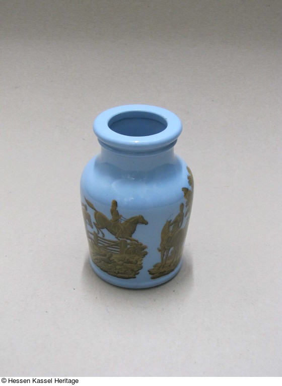 Steinzeug, hellblau glasiert, Druckdekor in Schwarz, von Hand hellbraun bemalt. |