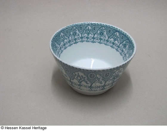 Steingut, heller Scherben, Umdruckdekor in Graugrün. |