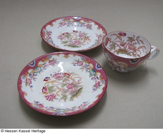 Tasse und zwei Untertassen mit Minton-Dekor Nr. 216 |