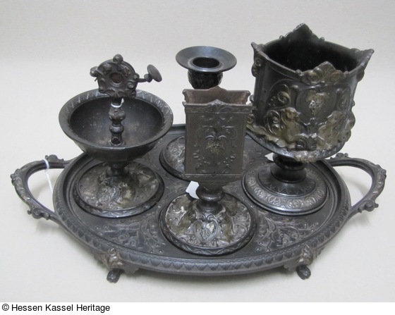 a: Tablett 4 x 34 x 21 cm (Objektmaß) b: Kerzenständer 11 cm (Höhe) b: Kerzenständer 8,1 cm (Durchmesser) c: Zündholzhalter 14 x 10 x 8,5 cm (Objektmaß) d: Zigarrenständer 12,5 cm (Höhe) d: Zigarrenständer 8 cm (Durchmesser) e: Zigarrenschneider 13,4 cm (Höhe) e: Zigarrenschneider 9,5 cm (Durchmesser)