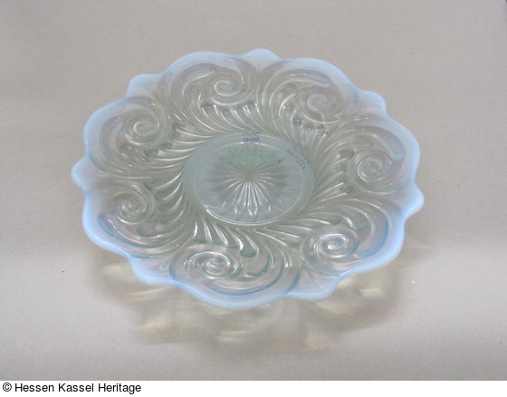 Teller mit barockisierenden, sich einrollenden Pfeifen aus am Rande opak anlaufendem Preßglas |