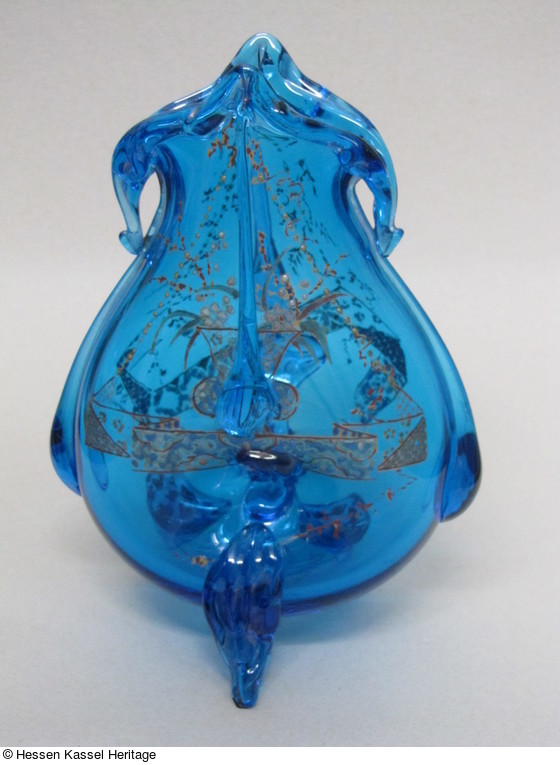 Blaues Glas, modelgeblasen, hüttentechnisch verformt und appliziert, opake Email-, rote Flaschfarben-, und Goldmalerei, Goldlüster. |