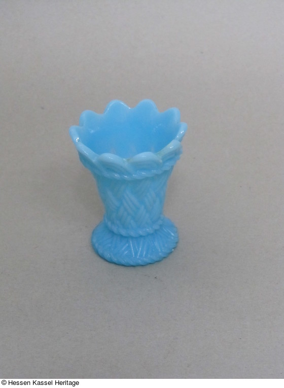 Kleine Vase aus opakem, türkisfarbenem preßglas, einen geflochtenen Korb imitierend |