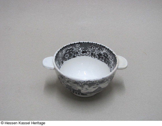 Steingut, schwarzer Druckdekor. |
