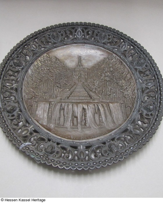 Wandteller aus Eisenguß mit der Ansicht der Kaskaden in Kassel-Wilhelmshöhe im Relief in Neurenaissance-Rahmen |