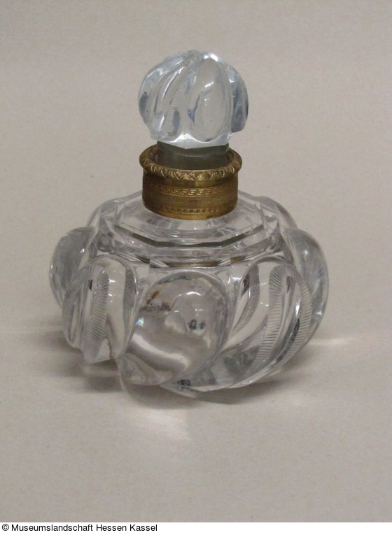 Flintglas, Kerb- und Schälschliff. Halsring mit vergoldeter Bronze eingefaßt. |