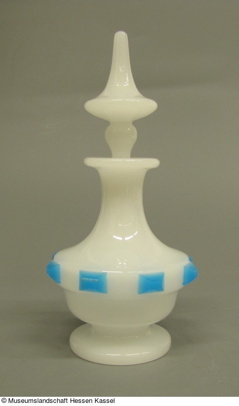 Opalglas mit geschliffenen, diamantförmigen, hellblauen Noppen. |