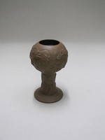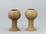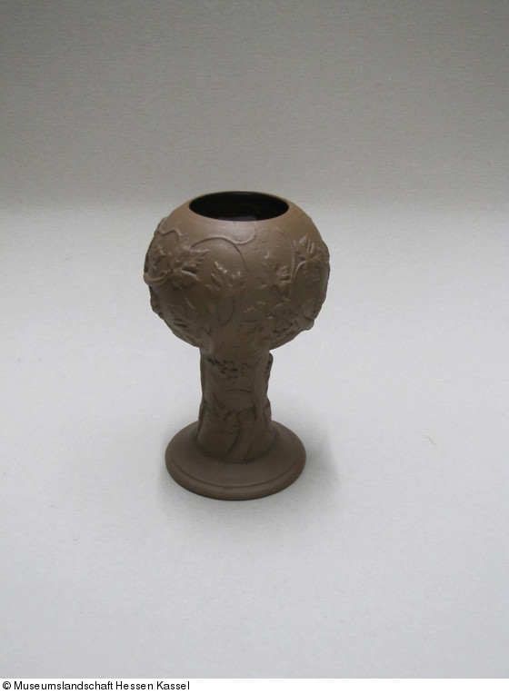 Graue Porzellanmasse mit mattbraunem Massebeguß (sog. Pfeiffer-Porzellan). Innenseite mit Transparentglasur. Reliefdekor. In vierteiliger Form gegossen. |