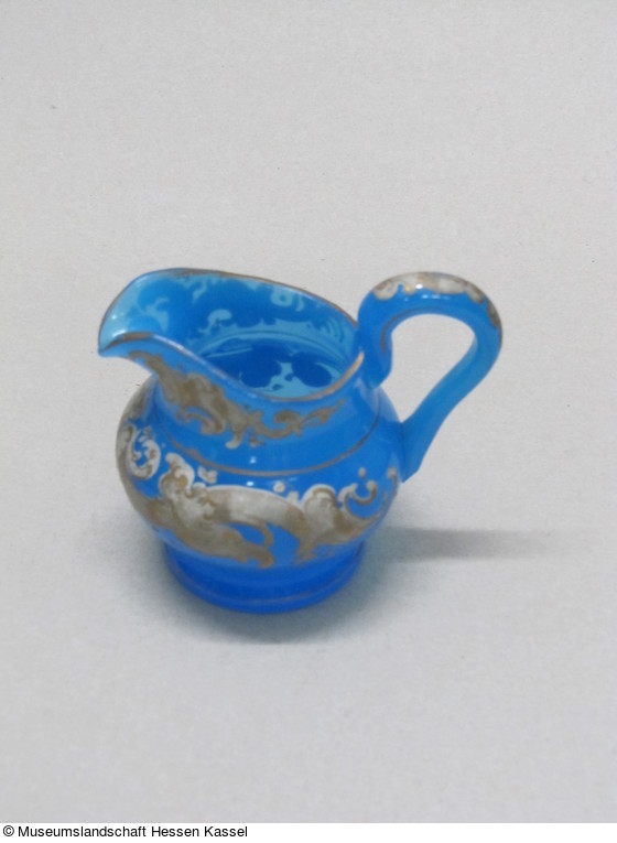 Hellblaues Opalglas, weiß und gold kaltbemalt. |
