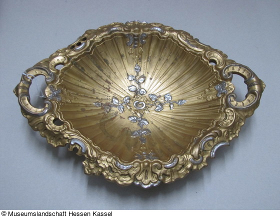 Steingut, roter Scherben, vergoldet und versilbert. |